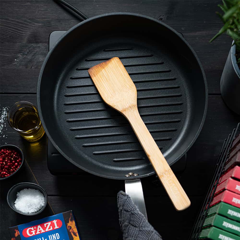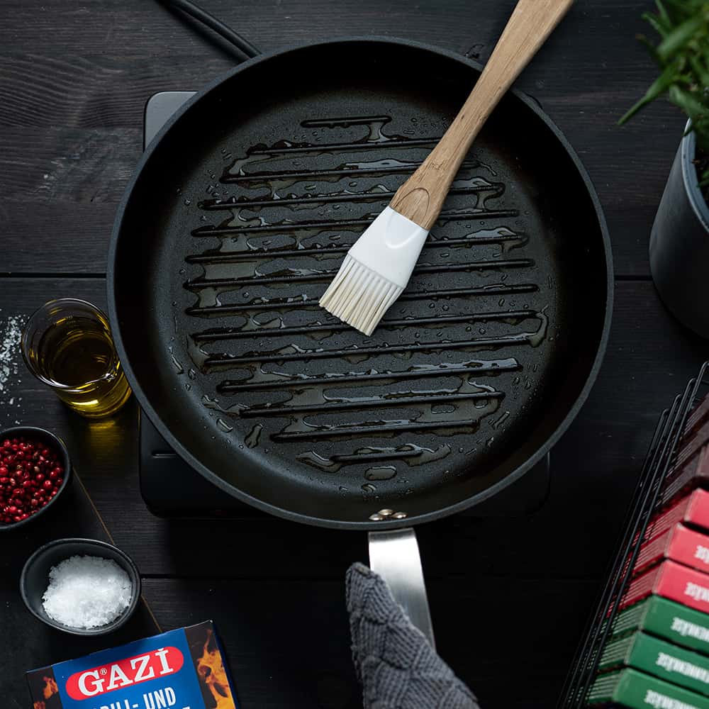 Eine Grillpfanne erkennt man ganz easy an ihren Rillen auf der Pfanneninnenseite. Der Vorteil: Das Grillgut liegt nur auf den Erhebungen auf, das Fett und die Flüssigkeit sammelt sich in den Rillen, so köchelt es nicht im eigenen Saft. Das Ergebnis wird lecker knusprig und man bekommt zusätzlich das schöne klassische Streifenmuster.